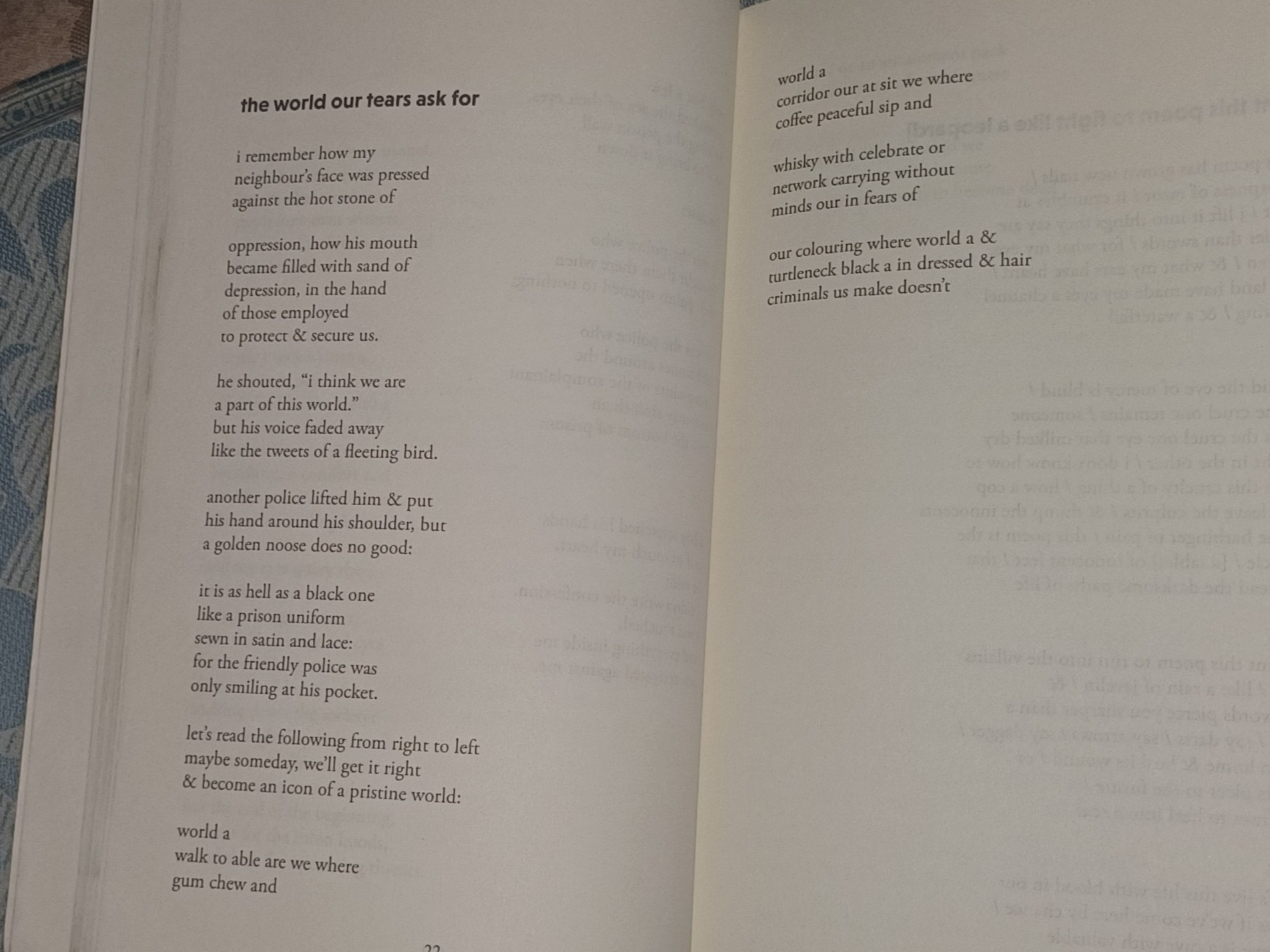 “the boy will someday rise into a / revolution, men revolting against a country that asks for heads / instead of thumbs, blood instead of nods...”