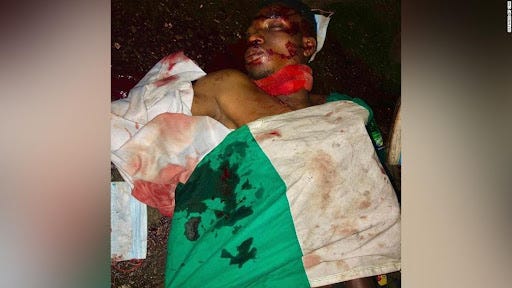 Then one image stood uniquely: blood-stained Nigerian flags, and that made me want to shout for help, wishing someone could lift the country out of the carnage it dwells in.