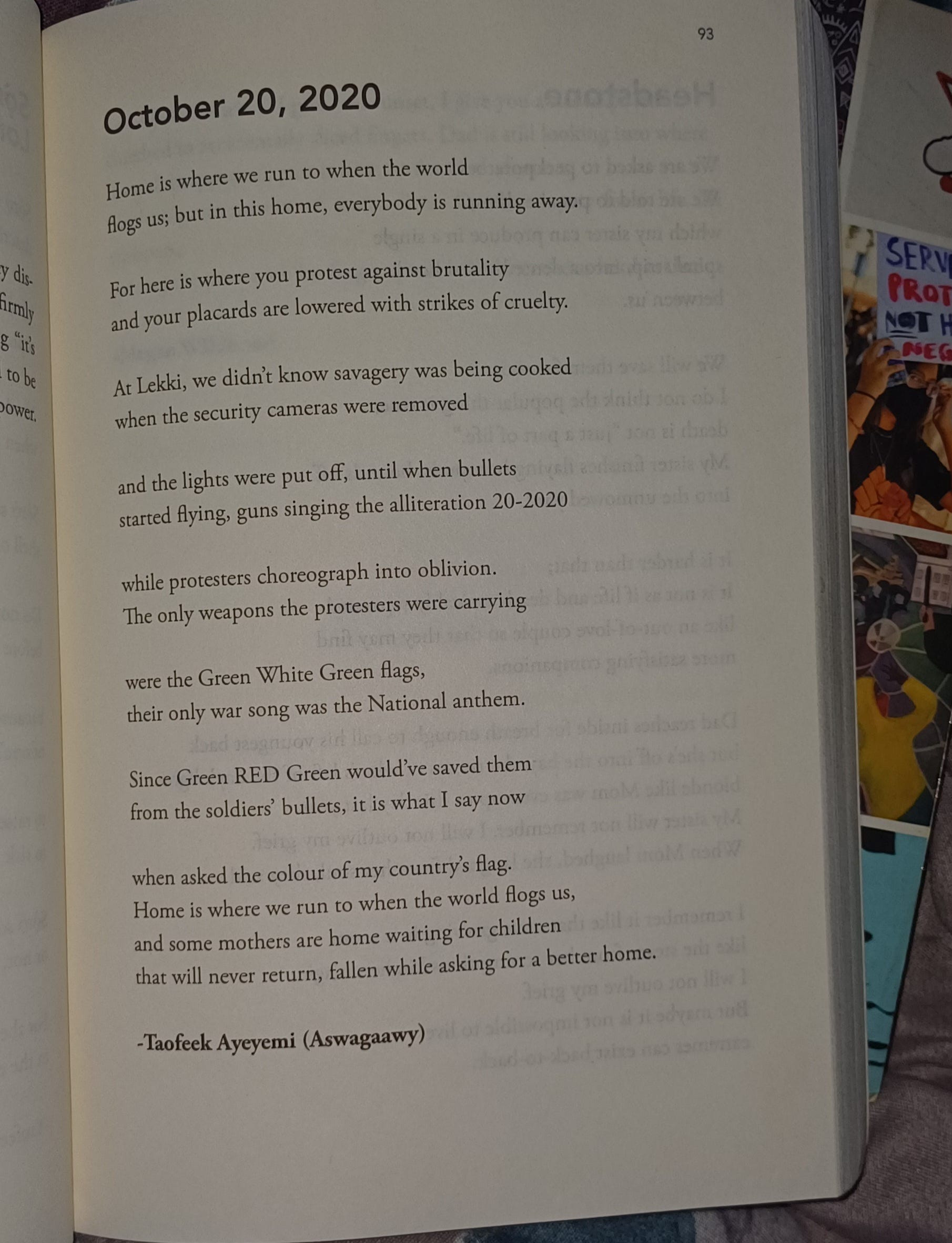 In Lagos, the Youth took over the revenue point of the government—the Lekki Tollgate, and refused to go home. Days began to run into a week. Some would go to work and resume there. Some didn’t even go to work at all. And the lines from the poem of Adedayo Agarau became instructive: